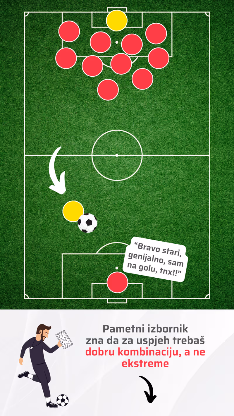Ako izbornik pošalje sve igrače reprezentacije pred protivnički gol - da, velika je šansa da će nešto zabiti. Također je velika šansa da netko izbije loptu nazad, vaš golman se nađe 1-na-1 s protivničkim igračem i primite gol.