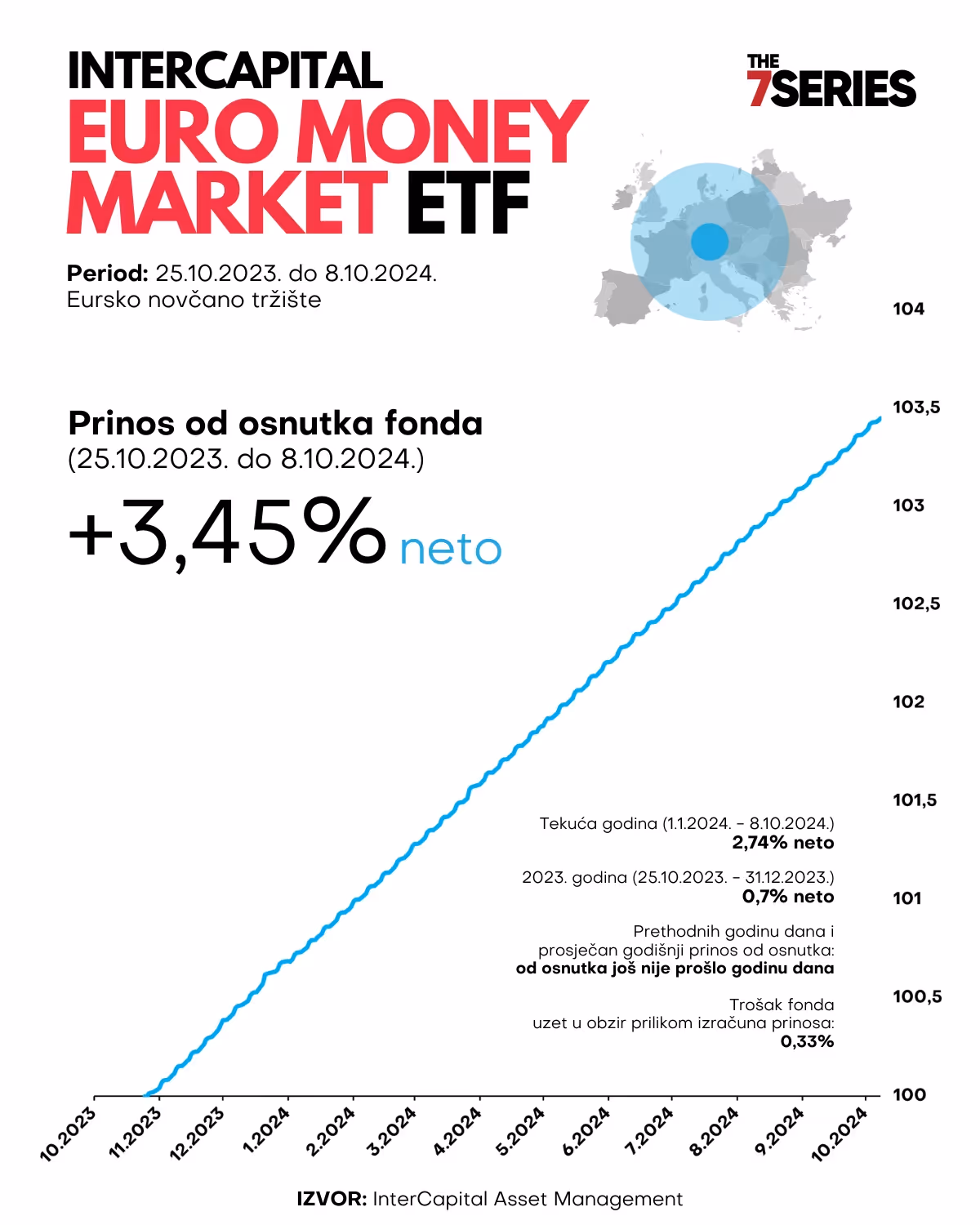 Naša ideja je za vas uvijek biti što bliže toj €STR kamatnoj stopi, odnosno omogućiti vam što bolji prinos. Prikazan je period od osnutka ETF-a, od 25.10.2023. do 8.10.2024.